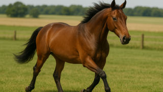 放牧地を走るサラブレッドの無料画像です。速度に特化した競走馬として知られる馬の姿を紹介します。競馬や馬種解説の記事に使えます。
