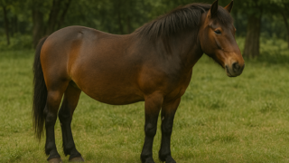 草地に立つ木曽馬の無料画像です。長野県を代表する日本在来馬で、山間地の農耕や運搬に活躍してきた歴史ある馬種を紹介します。