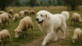 そばには家畜を守るための犬が歩いており、ヒツジ(羊)が落ち着いて食事できる環境が保たれていることがわかります。